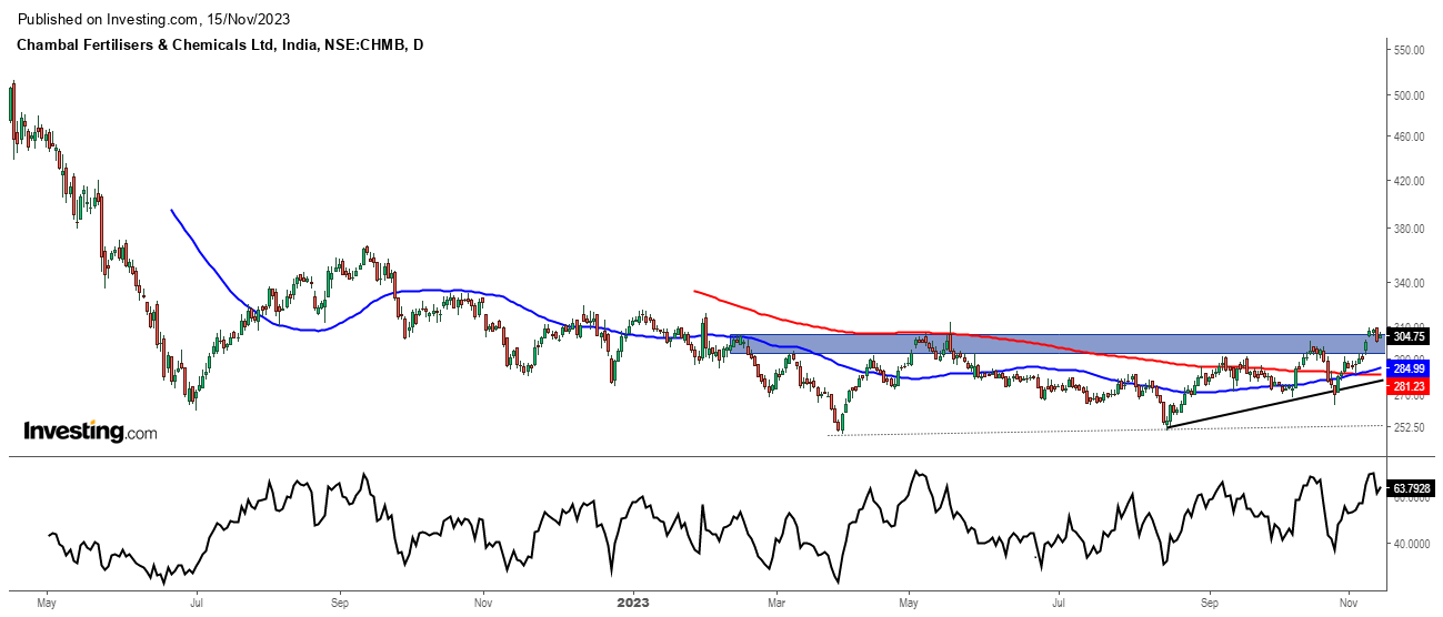 专家表示,化肥领域的一部分昌巴尔化肥和化学品有限公司在11月初从上升三角形中突破,很可能超过2022年12月的高点,在预算之前达到新的52周高点。