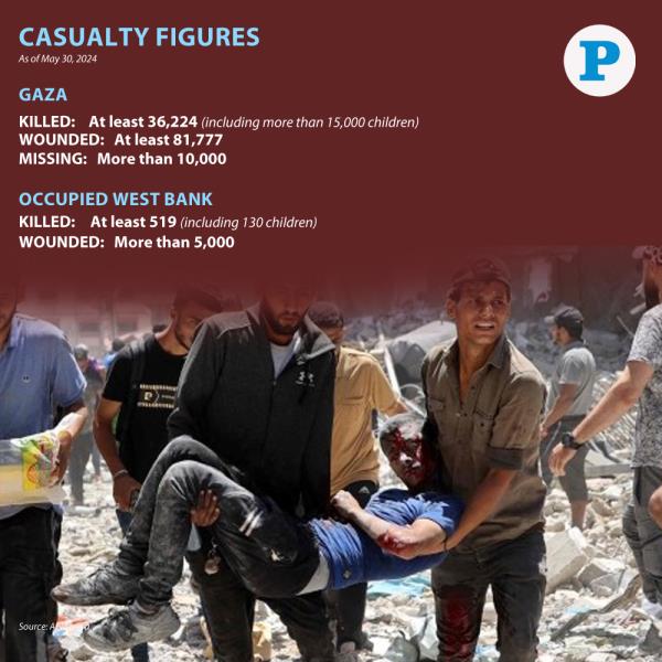 加沙:自2023年10月7日开始对加沙地带的持续侵略以来,以色列占领至少杀害了36,224名巴勒斯坦人,至少造成81,777人受伤。